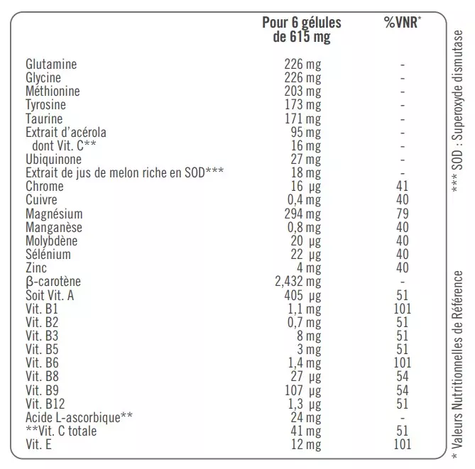 – Extramel® extrait de jus de melon (Cucumis melo L.) riche en SOD (superoxyde dismutase)