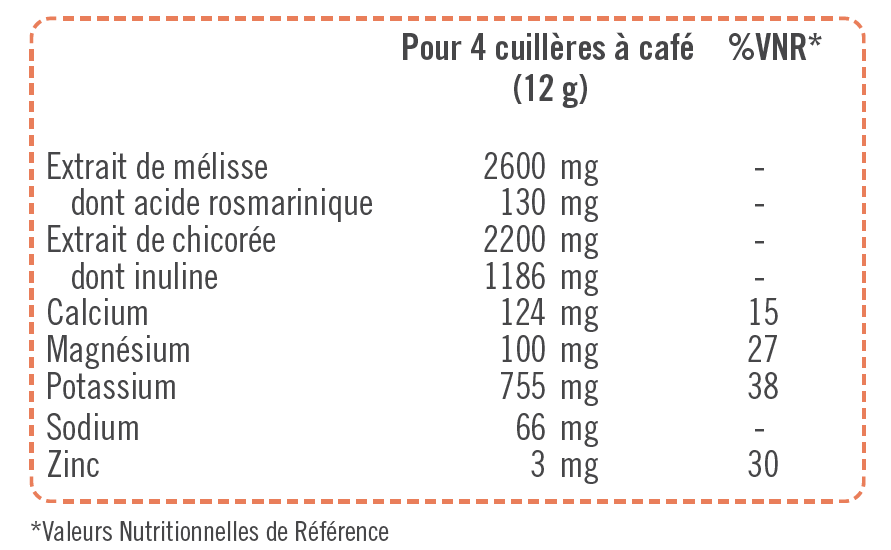 1 – Contribue au confort et à la fonction digestive, ainsi qu’au mouvement gastro-intestinal grâce à la chicorée et à la mélisse ; participe à la stimulation de la production des fluides digestifs grâce à la chicorée.