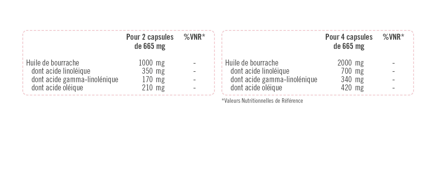 2 – Le LA (acide linoléique) contenu dans l’huile de bourrache est un acide gras oméga-6 qualifié d’essentiel car l’organisme est incapable de le synthétiser, il doit donc être apporté par l’alimentation.