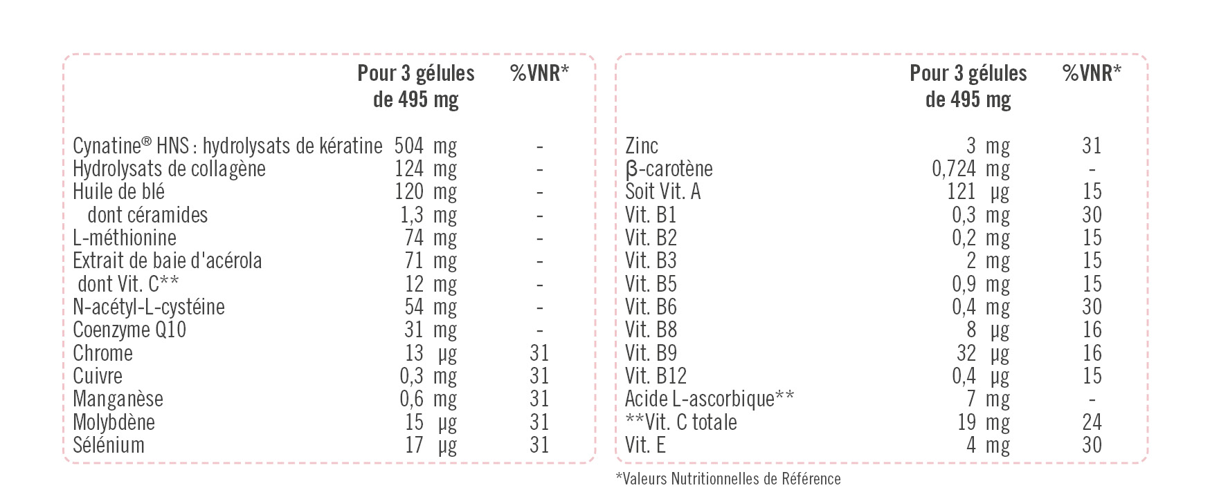 1 – Contribue à la formation normale du collagène pour assurer la fonction normale de la peau grâce à la vitamine C. Contribue au maintien d’une peau normale grâce au zinc et aux vitamines A, B2, B3 et B8. Participe à la pigmentation normale de la peau grâce au cuivre.