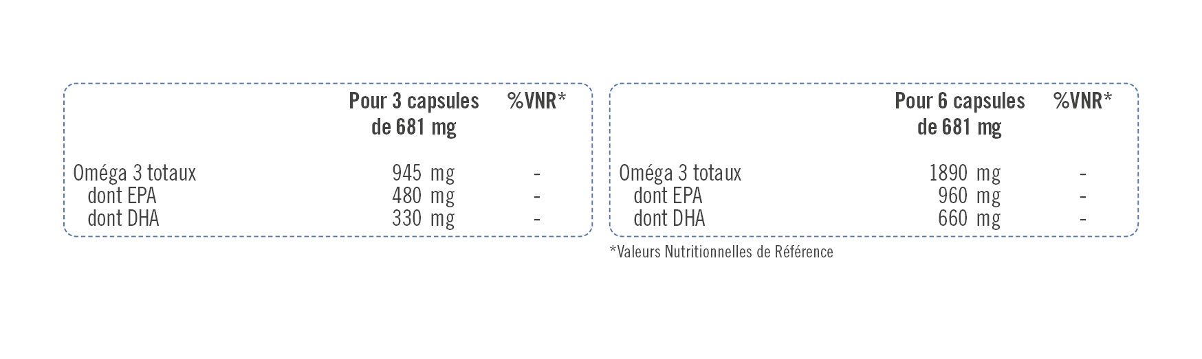 1 – Apporte un équilibre d’acide eicosapentaénoïque (EPA) et d’acide docosa­hexaénoïque (DHA). Une consommation journalière de 250 mg de DHA participe au maintien des fonctions cérébrales normales.