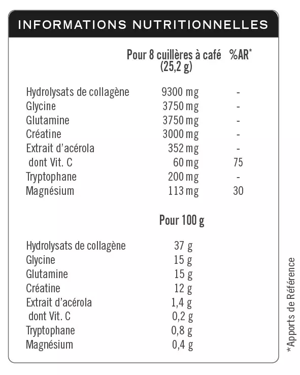 Pot de 378 g de poudre / Dose optimale : 12,6 g à 25,2 g soit 4 à 8 cuillères à café par jour (20 à 40 mL).