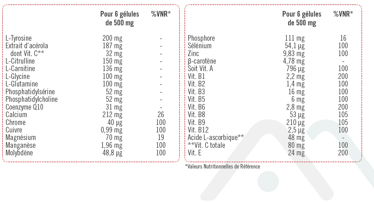 Contribue à la réduction de la fatigue par un apport en magnésium et vitamines B2, B3, B5, B6, B9, B12 et C.